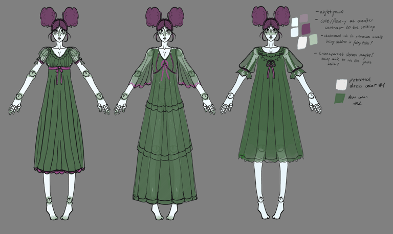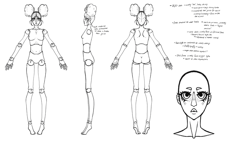 Since the focus was to create a subtle eerie environment, the princess needed to feel like a natural part of it. I drew inspiration from BJD dolls, since their long and delicate bodies and limbs reinforce the overall tone of the world. The princess's color palette is kept slightly desaturated, with subtle skin tones and blush chosen to give her a sickly, almost fragile appearance. The hairstyle was kept simple, to make it easier to model and animate. Only the pony was slightly changed during the modelling process.