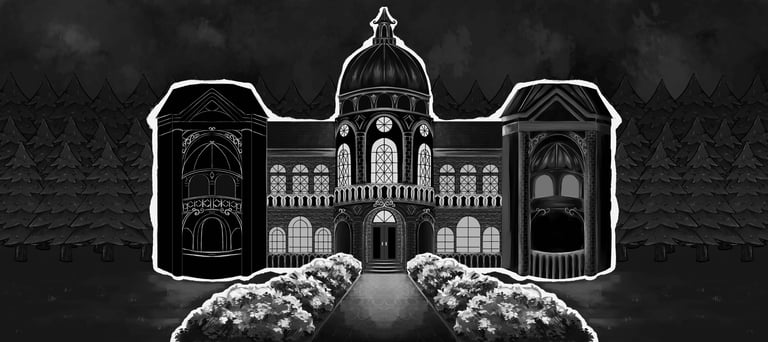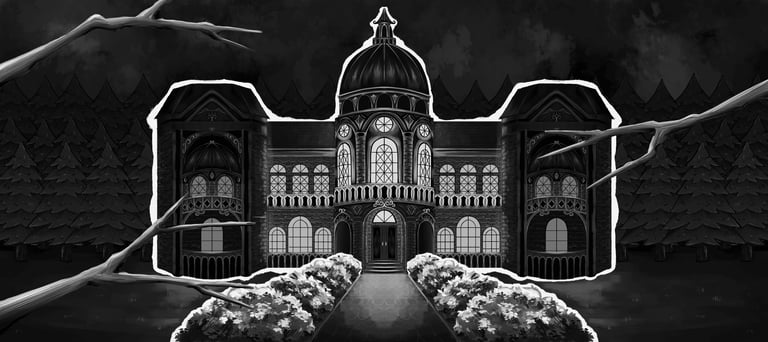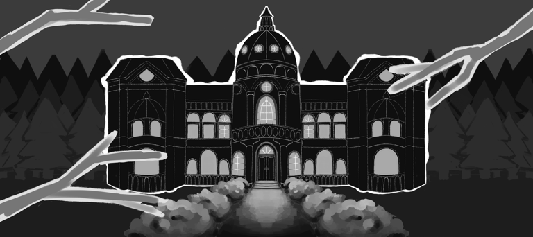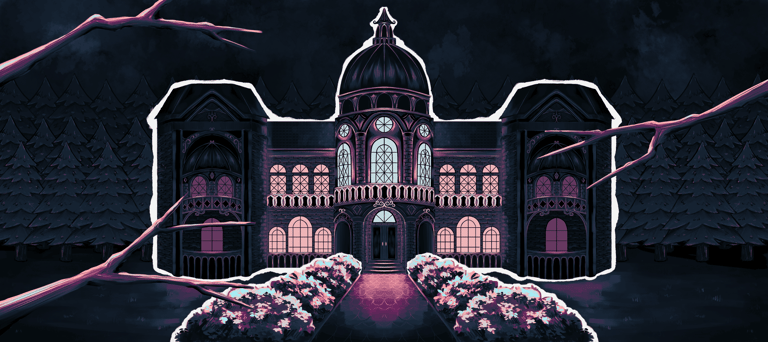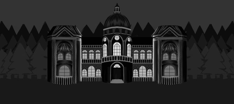 The backgrounds follow the same aesthetic, dark and slightly eerie. They were all originally painted digitally in grayscale and then brought to life through the use of a gradient map. For the beginning of the animation, the castle is separated in multiple layers to achieve a subtle parallax effect.